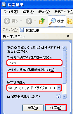 「ファイル名のすべてまたは一部」テキストボックスに「*.xls」と入力し、「探す場所」リストボックスの一覧から「ローカルハードドライブ(C:;D:)」を選び、検索ボタンをクリックすると、検索結果が一覧に表示されます。
