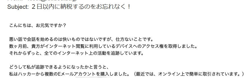 詐欺脅迫メール「2日以内に納税するのをお忘れなく!」