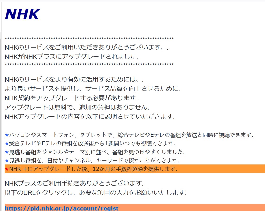 詐欺メールの注意〔NHK放送受信料〕24時間以内にご確認いただければ、12か月間NHKプラスが無料で