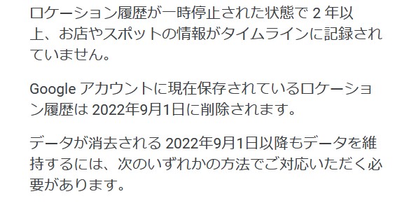 ロケーション履歴が一時停止された状態で 2 年以上、お店やスポットの情報がタイムラインに記録されていません。 Google アカウントに現在保存されているロケーション履歴は 2022年9月1日に削除されます。 データが消去される 2022年9月1日以降もデータを... -