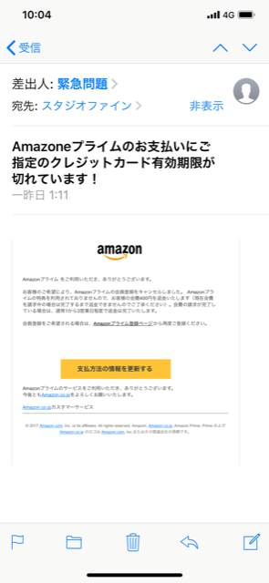携帯に、このようなメールが届きました。携帯だと差出人のアドレスがすぐに見れないので、セキュリティをかいくぐってきた、こんなメールに、すぐに対応してしまうと、被害に合いますので、さらに注意が必要です。 同じメールをパソコンで見ると、セキュリティのおかげで、ゴミ箱に処分されていました。