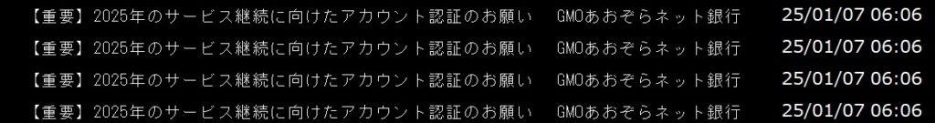 GMOあおぞらネット銀行を騙る詐欺メール。 皆様今年も、気を引き締めて、詐欺メールにひっかからないよう 気をつけましょう! 重要: 2025年に向けたアカウント認証のお願い 2025年のサービス更新に備え、アカウントの認証が必要です。平素は格別のご高配を...