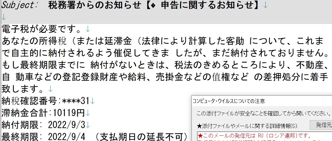 URLをコピーしました! 「税務署からのお知らせ【�申告に関するお知らせ】」という題名。漢字がところどころ中国語、不自然な空き、熟語の間違いで、比較的わかりやすい詐欺メール(怒) アドレスもなりすまし。 即、削除ですよ! お知らせ よかったらシェアしてね! URLをコピーしました! e-Tax(国税電子申告・納税システム)を騙る詐欺メール 必要なアクション - ID~という題名の詐欺メールにご注意ください この記事を書いた人 ty 関連記事 Studio FINEができること 2026/2/27 Friday 更新できなかった教室サイトが、“問い合わせが来るサイト”に変わった事例 2026/2/27 Friday 神戸のホームページ保守・WordPress管理なら|月額22,000円〜 2026/2/27 Friday 詐欺脅迫メール「2日以内に納税するのをお忘れなく!」 2022/11/23 Wednesday 偽画面 Amazonプライム 2022/11/15 Tuesday 【詐欺メール】amazen株式会社から緊急のご連絡 2022/11/14 Monday 必要なアクション – ID~という題名の詐欺メールにご注意ください 2022/11/11 Friday フィッシング詐欺メール[American Express] カードの利用が一時停止されました。 2022/8/21 Sunday