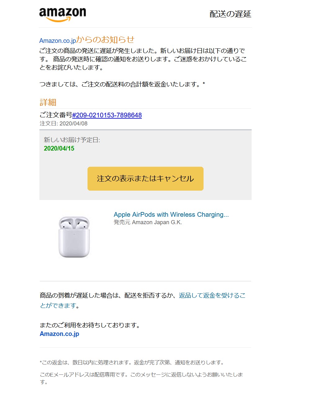 配送の Amazon.co.jpからのお知らせ ご注文の商品の発送に遅延が発生しました。 新しいお届け日は以下の通りです。 商品の発送時に確認の通知をお送りします。 ご迷惑をおかけしていることをお詫びいたします。