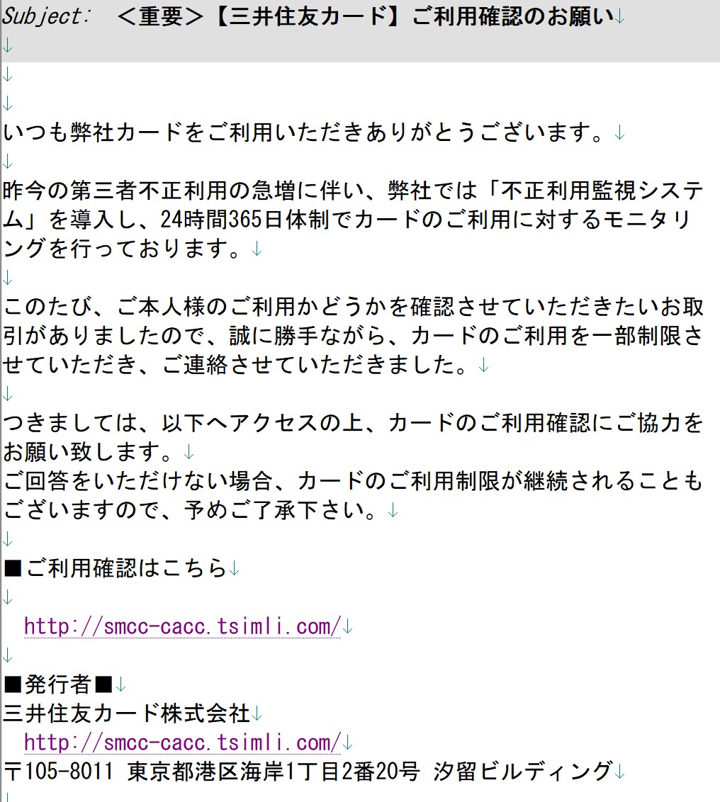 ご回答をいただけない場合、カードのご利用制限が継続されることもございますので、予めご了承下さい。 ■ご利用確認はこちら 詐欺サイトへのURL・・・ 本物そっくりのカードご登録内容の照会ページへ誘導 カード番号その他を入力させる画面 ただし、一切他のページへは飛べないようになっている。 ■発行者■